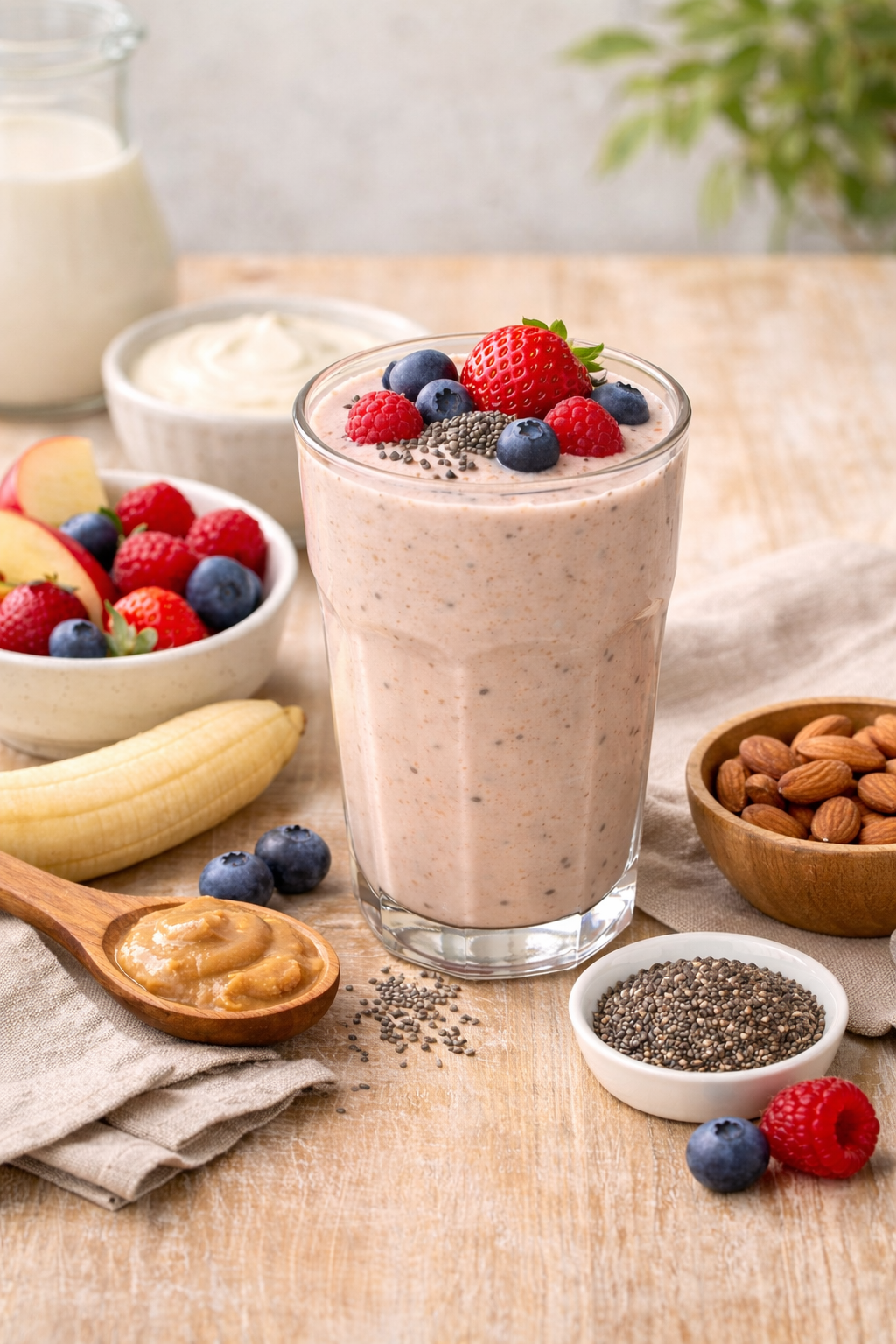 Die Früchte zusammen mit Joghurt, Milch und Mandelmus in einen Mixer geben und alles auf hoher Stufe mixen, bis eine samtige Textur entsteht.